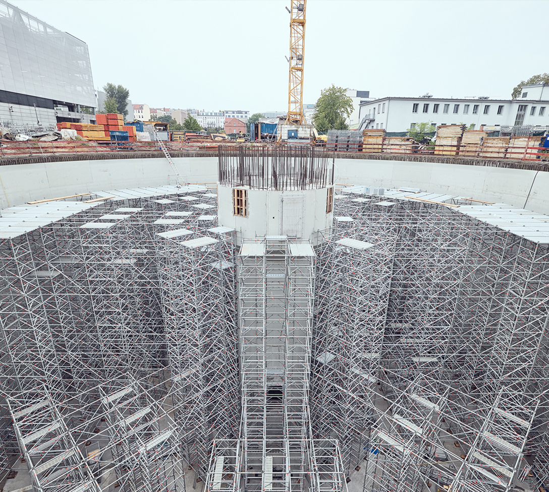 Die Montage eines Traggerüsts für das Betonieren der meterhohen Decke von „Berlins größter Regentonne“ stellte die Karl Köhler Bauunternehmung vor einige Herausforderungen: die runde Form mit einem Durchmesser von rund 40 m. Das sichere Ableiten der hohen Vertikallasten über eine Stützhöhe von 18 m. Und das Umsetzen von Baustellenanforderungen wie die Integration eines Treppenturms für den Baustellenzugang sowie einer sicheren Arbeitsebene unterhalb der Schalung. Die Kombination aus Digitalisierung auf Grundlage des Prozesses Layher SIM sowie Einsatz des Allround Traggerüsts TG 60 in Verbindung mit dem hochtragfähigen Aluminium-Träger TwixBeam als Jochträger ermöglichte eine optimal an die Gegebenheiten angepasste und trotzdem materialsparende Traggerüstkonstruktion. Dies sorgte für eine hohe Baustelleneffizienz.