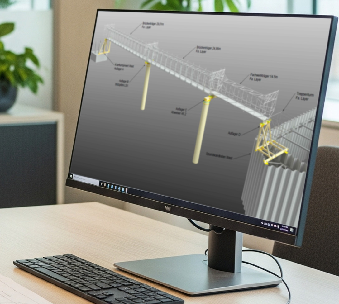 Die Gerüstkonstruktion wurde in 3D vorgeplant. Auf diese Weise konnten das Bauunternehmen Meyer, das Ingenieurbüro Schumacher sowie die Layher Anwendungsingenieure die Konstruktion anhand des digitalen Gerüstzwillings eng abstimmen.