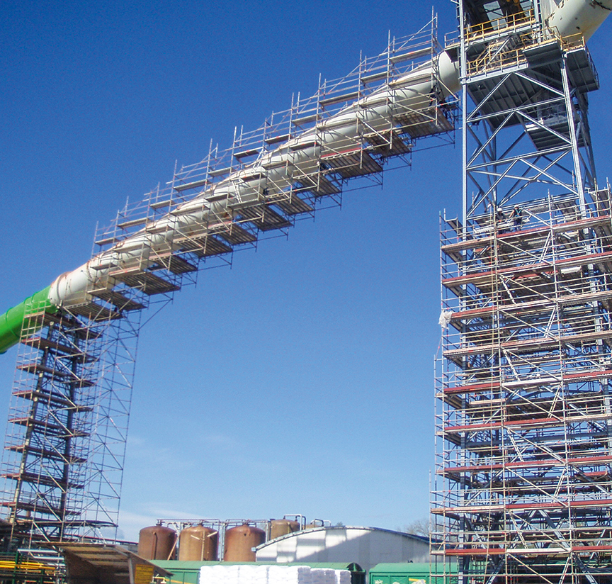 Bei sehr hoch gelegenen Arbeitsbereichen sind aufgetänderte Gerüste aufgrund hoher Material- und Arbeitskosten oft unwirtschaftlich. Mit dem AllroundGerüst lassen sich Hängegerüste für solche Anwendungsfälle problemlos realisieren.