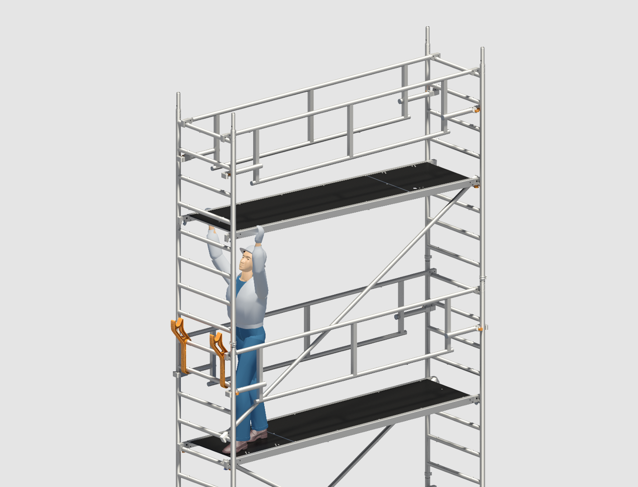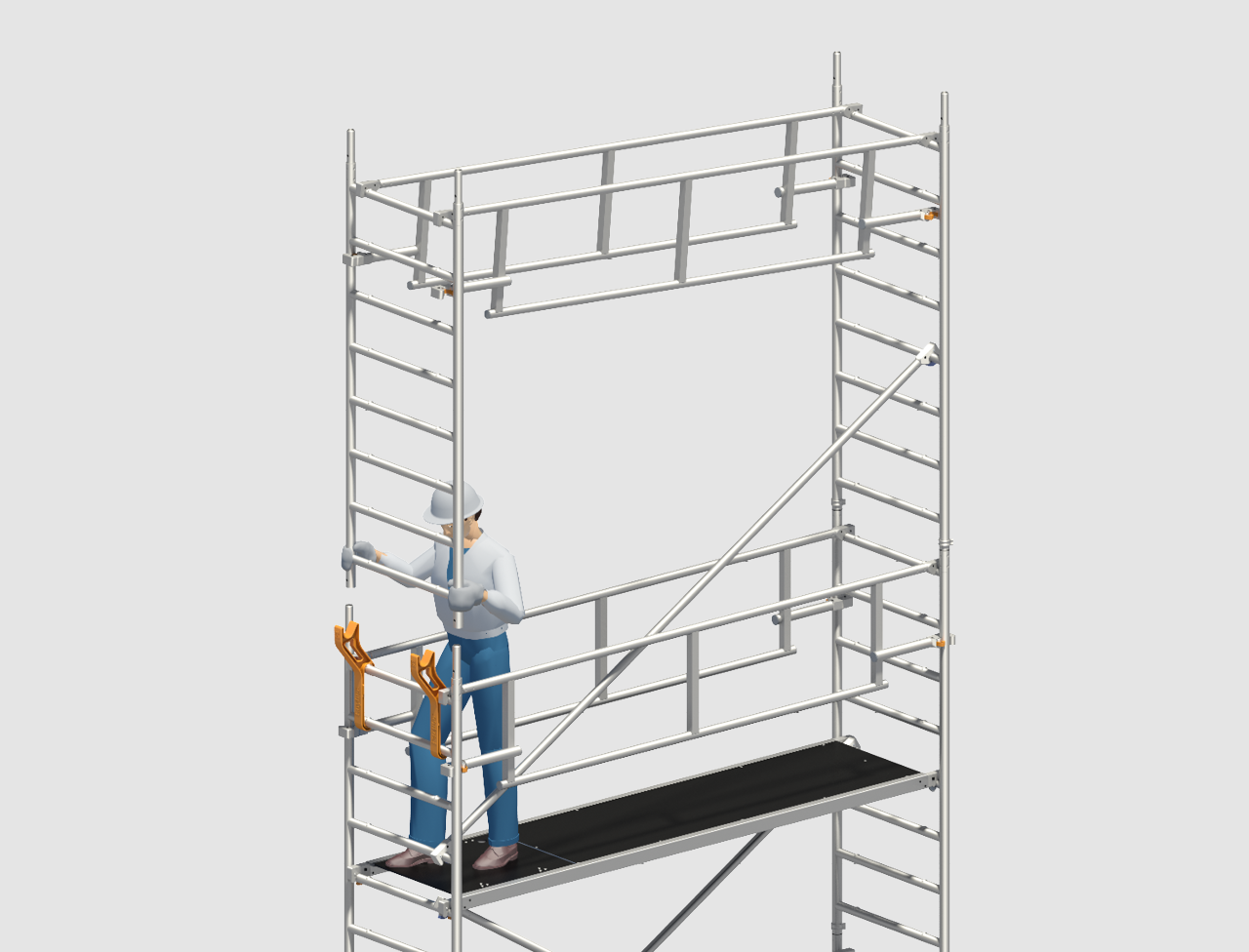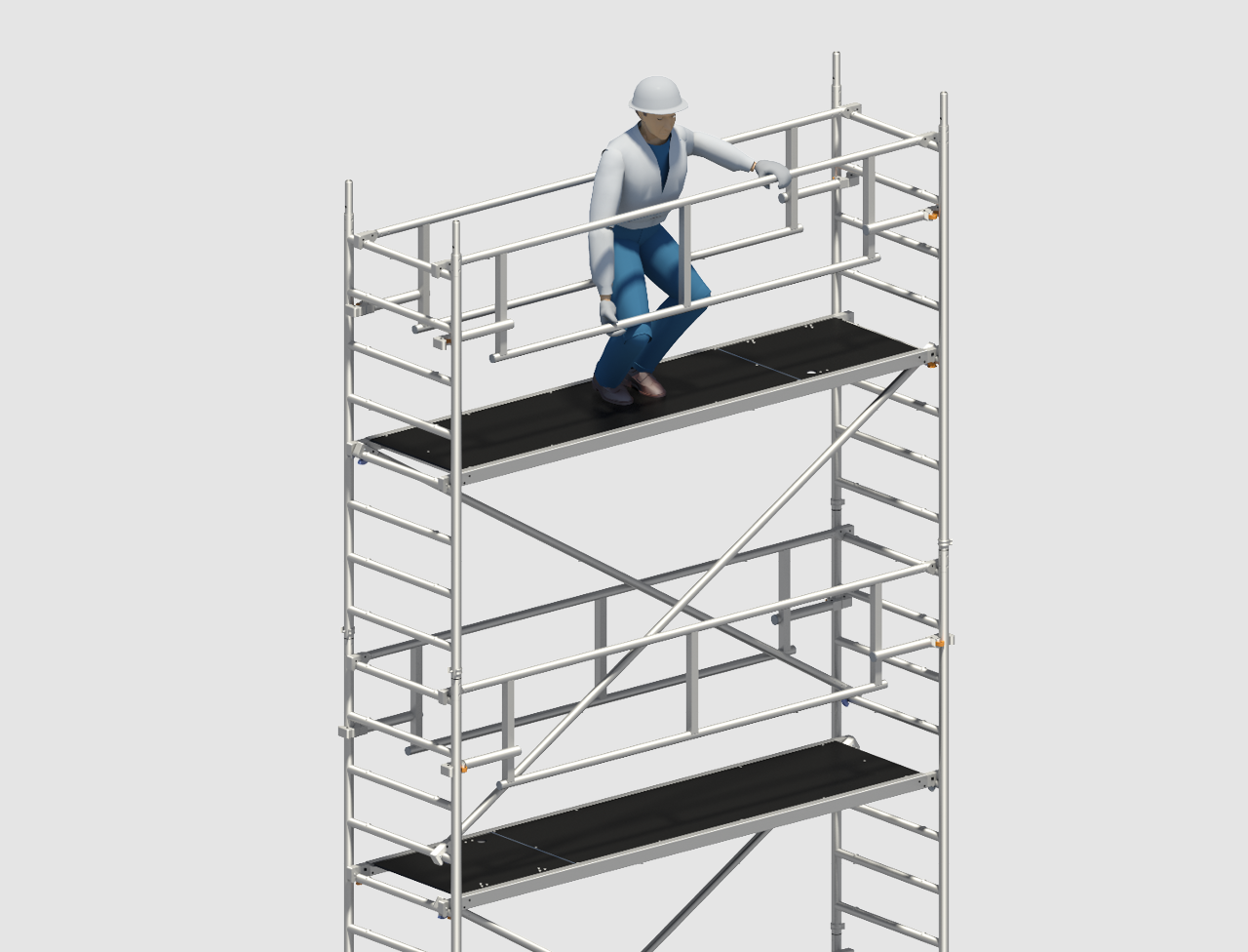 Safety structure P2 SAFETYPLUS with the new double guardrail implements a collective safety measure for rolling towers, in the form of system-integrated advancing side protection ensuring greater safety when moving up to the next level. Assembly and dismantling are only possible from the next level below that is already secured. That technically rules out any circumventing of the safety regulations, and full compliance with the current version of DIN EN 1004 and with the valid European health and safety legislation is assured. More safety for the user and hence for the client too.